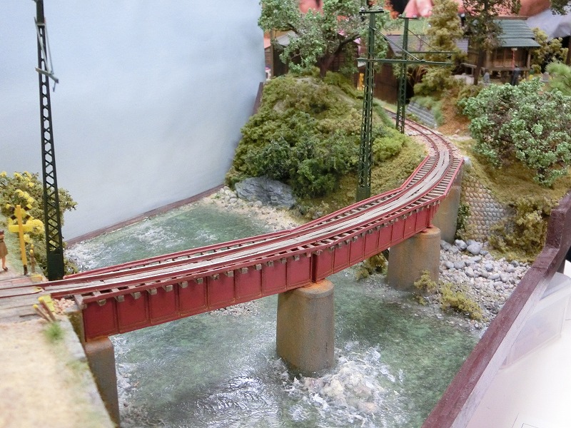 毎度おなじみ木曽モジュールクラブより、去年も穴が開くほど見続けた大好きなセクション。鉄橋というのは川を渡るものという固定概念がありますが、道路もまたいでいるところが立体感があってとても好きなのです。築堤と、そこに無造作に生える木々の表現もメリハリがきいていてとてもいいですね。