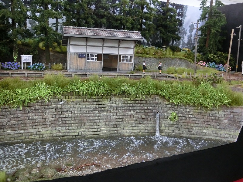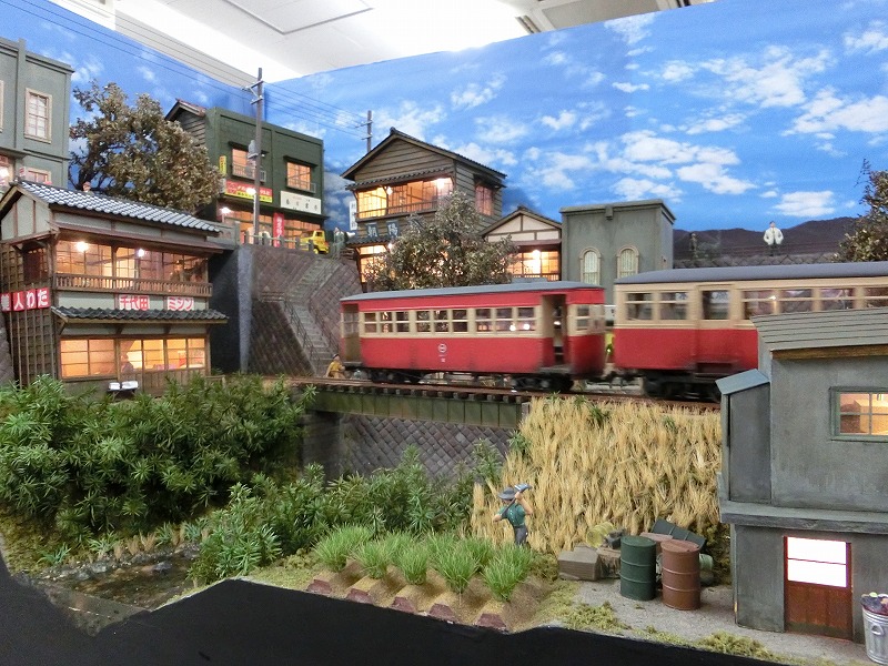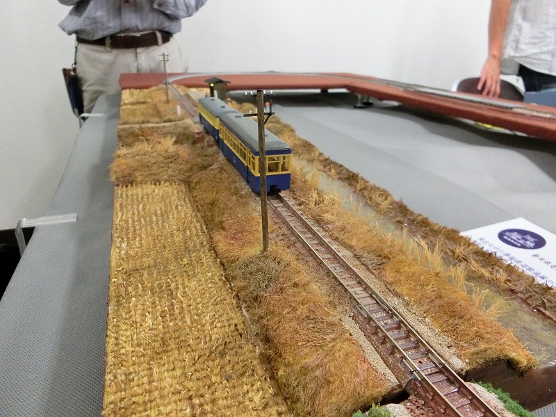 静岡の大軽便、静岡鉄道駿遠線にこだわるクラブの作品です。実際の情景をモデルにするだけあって、まあ手間かかってます、という言葉が薄っぺらく感じられるくらいに手間かかってますよコレ。アップに耐えられるジオラマってなかなかないですから。刈り取られた稲わらと用水路の間を走り抜ける気動車と客車の編成、絵になります。