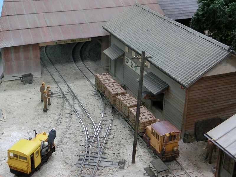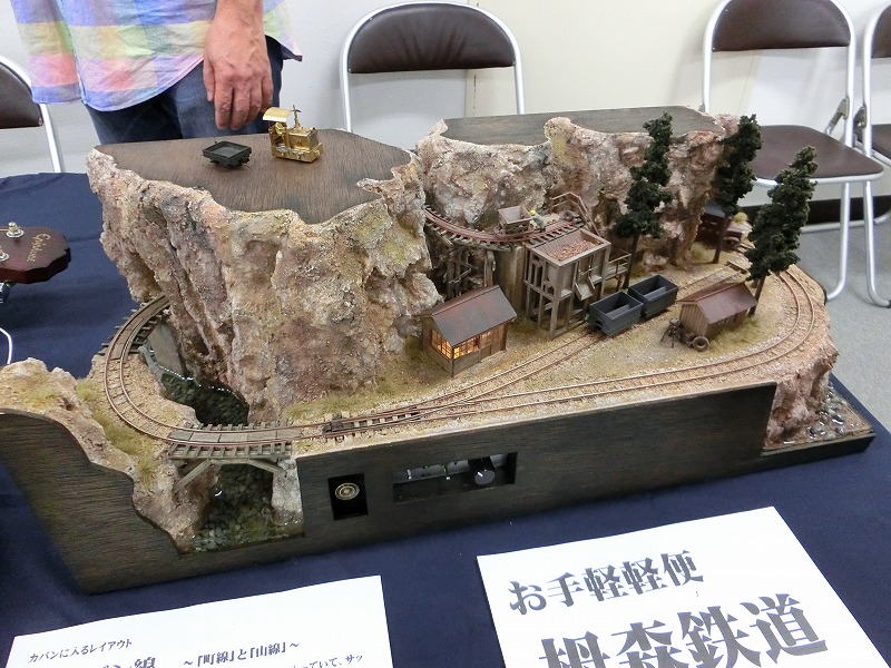 それぞれ別の方の作品ですが、軽便には色々な楽しみ方があるんだよという2作品。上のレイアウトは、なんとカバンに入って持ち運べてしまう、その名も「カバン線」。スペースがなくても軽便はできるのです。下はこんなガレージがほしいなという小さなレイアウト。超急曲線ですが、ホイールベースが短い軽便車両は難なく走ります。